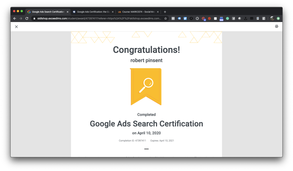 The Google Ads Search Certification has been a great tool to help me further develop a deeper understanding of the platforms advertising power and tools for marketers. I was able to take to the Google search ads exam and receive my certification and can now continue to advance my skills with Google and acquire more certifications.